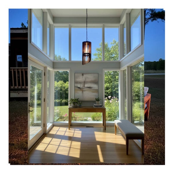 Reclaimed Hardwood handcrafted chandelier with an hourglass light in the center.